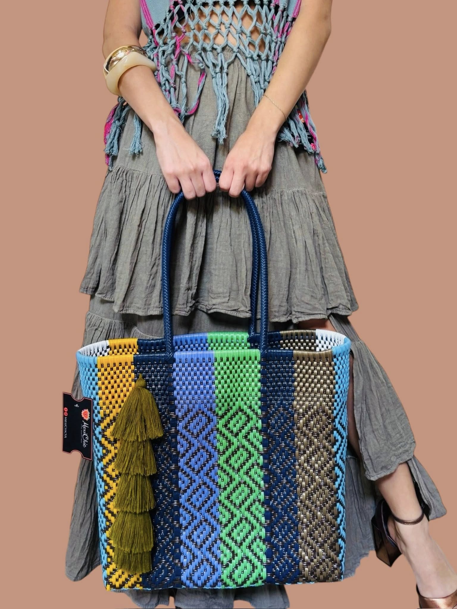 Crafted from recycled plastic in Oaxaca, this tote bag is sturdy and ideal for work, daily errands, or a beach outing. Its lasting durability ensures it will be a reliable companion, while its colors beautifully capture the essence of fall.